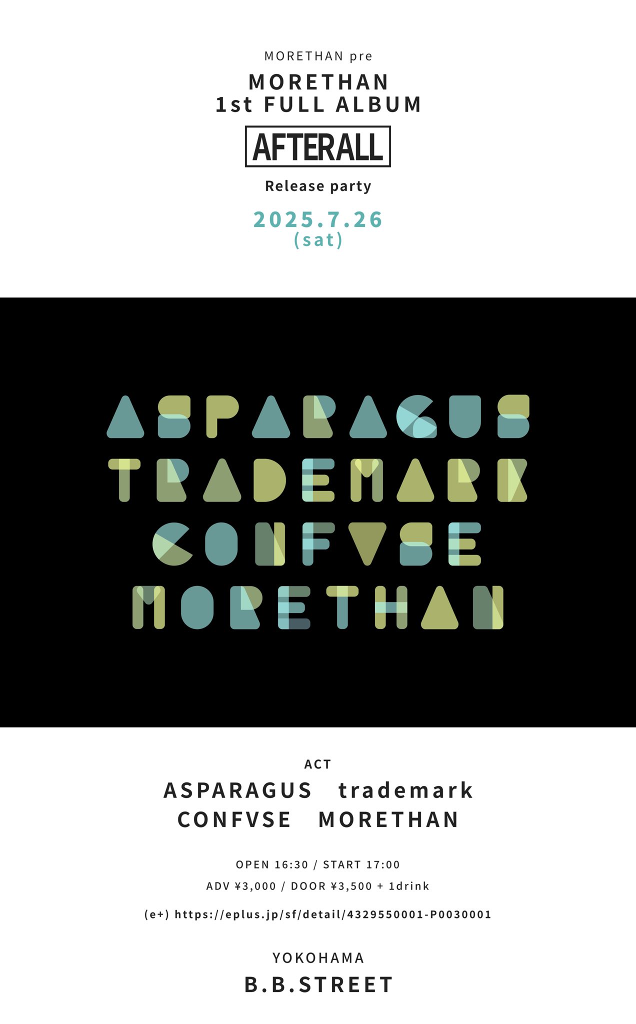ASPARAGUS trademark CONFVSE MORETHAN open/16:30 start/17:00 (20:40頃終演予定) adv/¥3,000+1d(¥600) door/¥3,500+1d(¥600)